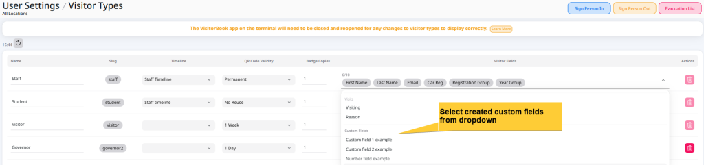 Once you have created custom fields, the next step is to assign these to visitor types.