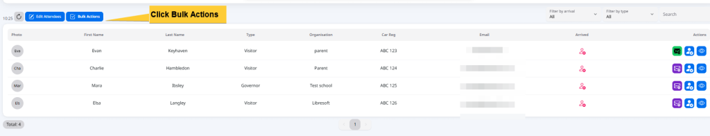 | Click the Bulk Actions button. | The system opens the Bulk Action button to show a button group with available bulk action options. It also shows a tick box option so you can select people. | The button group options are faded and won’t become active until you have selected people. |
