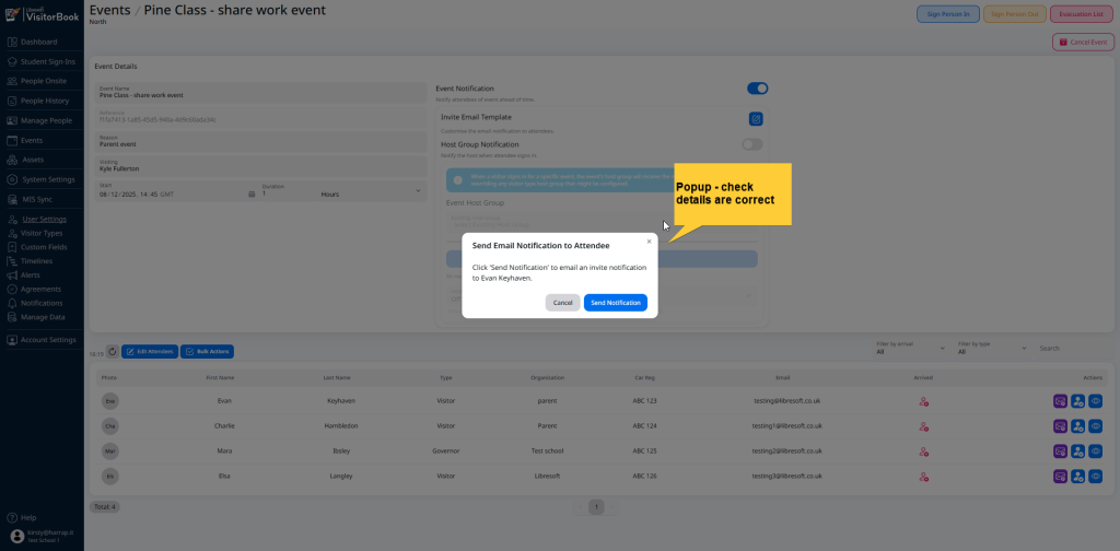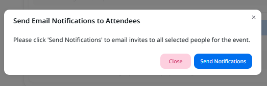 | Once you have selected your chosen attendees, click the Email Event Invite button. | The system displays a Send Email Notifications popup asking you to confirm the action. | |