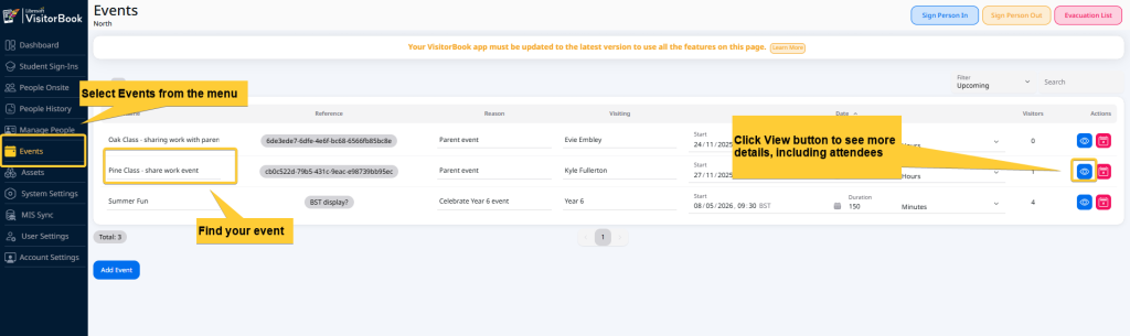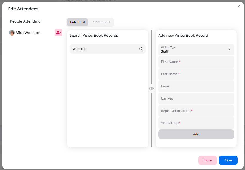 - Add new VisitorBook record – A section to enable you to add an entirely new visitor to the event.