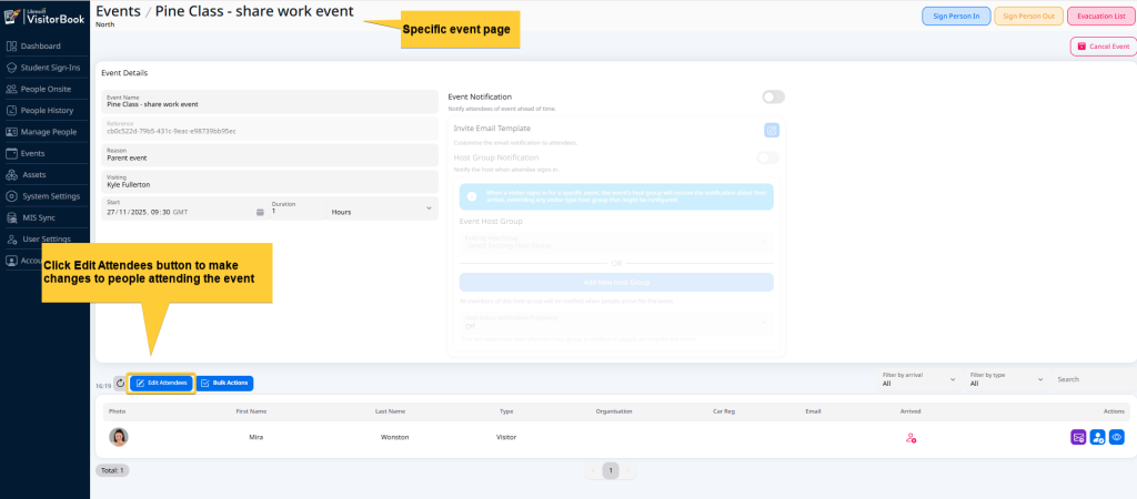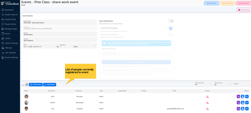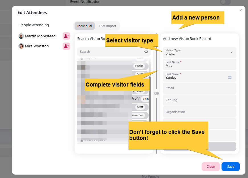 Important: The Edit Visitors popup gives you the opportunity to see people registered for an event or add people to an event. The process of adding people to an event does not sign them into VisitorBook. They will still need to sign in when they arrive.