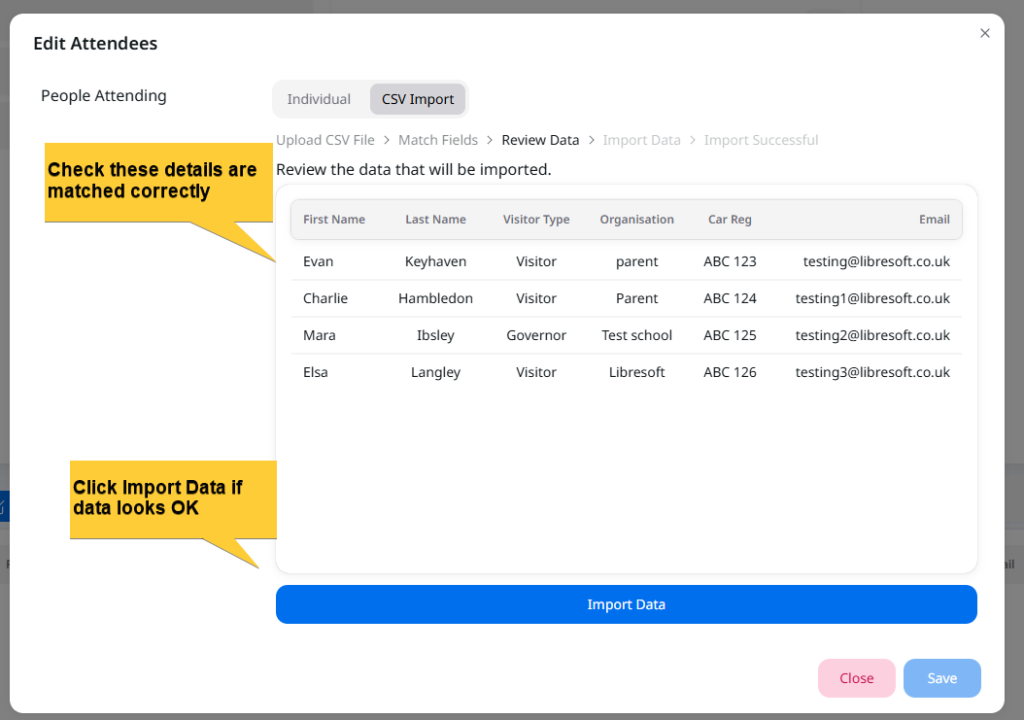 | Click the Import Data button. | The system moves to the Import Successful step and shows you the data that has been imported. | Important: Don’t click away yet! There are a couple more steps to do! Also important: Where possible, the system will attempt to match imported data with existing VisitorBook records, based on email address. If it cannot match existing data, it will create a new record. Given the import behaviour (noted earlier), it is essential you check the data matches your expectations here. |