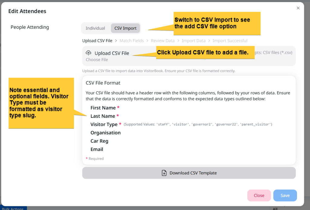 | Match the fields in the CSV file to VisitorBook fields by selecting them from the dropdown. | Matching is an essential step. First Name, Last Name and Visitor Type are essential and MUST be matched. Take care here to check you are matching the fields correctly. | |