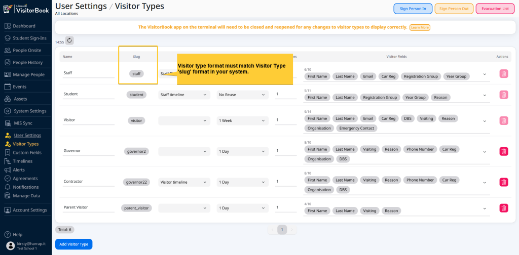 Important: The format of the visitor type must be an exact match to the Visitor Type ‘slug’ shown on the Visitor Types page.