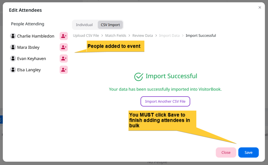 | Click the Add People to Event button. | The system moves the imported attendee data to the list of People Attending. | Important: Don’t click away yet! There’s a final step! |