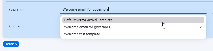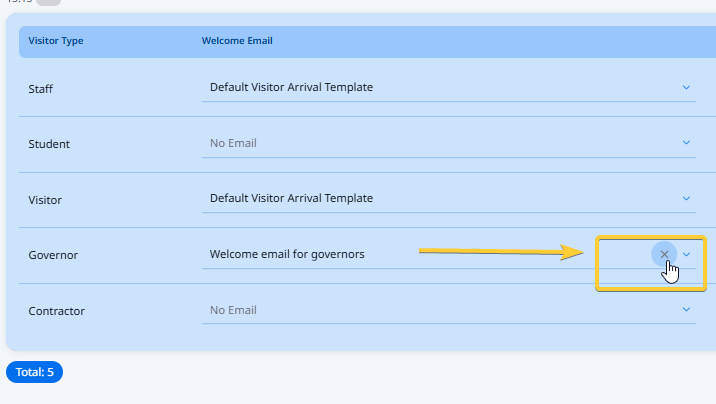 - Next to the relevant visitor type, in the Welcome Email or Farewell Email column, select the desired email template from the dropdown list.